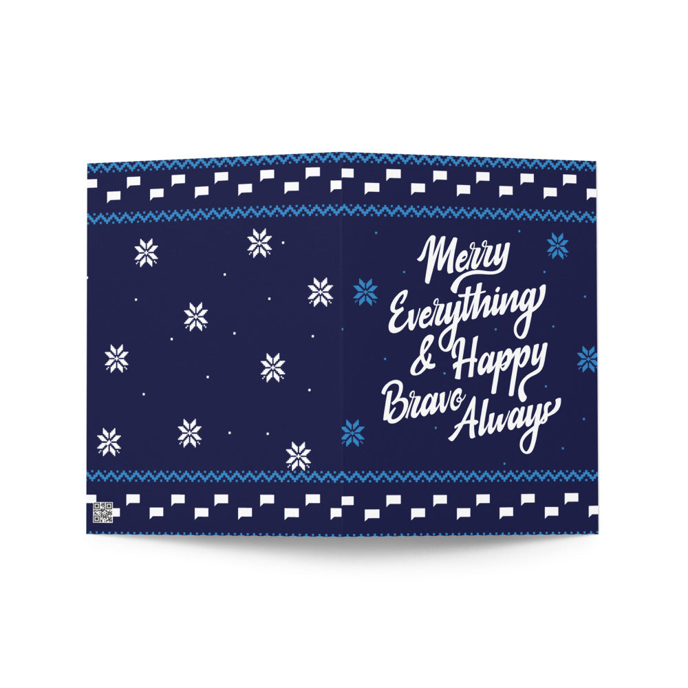 Send your warmest wishes this holiday season with the Bravo Merry Everything and Happy Bravo Always Greeting Card. This festive card combines the joyous spirit of the holidays with a touch of Bravo's signature charm, making it the perfect way to connect with fellow fans and loved ones alike.
